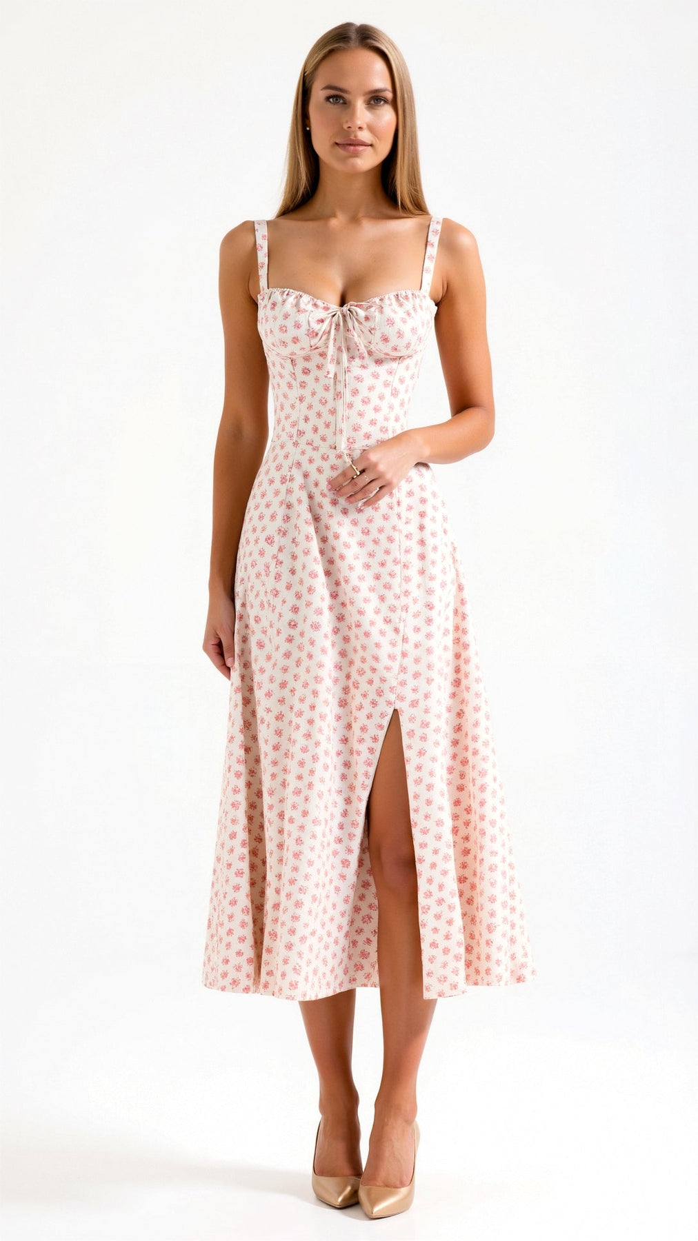 O Vestido Midi Julia é a expressão perfeita da feminilidade delicada com um toque retrô. Com um busto franzido e detalhes de amarração, seu corpete estruturado oferece leve sustentação, enquanto a saia em A fluida, com uma fenda frontal graciosa, garante movimento e elegância.
