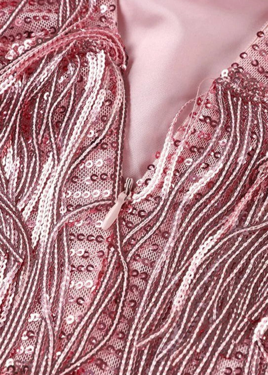 O corte justo com alças finas realça a silhueta feminina, enquanto as camadas de lantejoulas refletem a luz em cada movimento. Um vestido feito para ser notado.