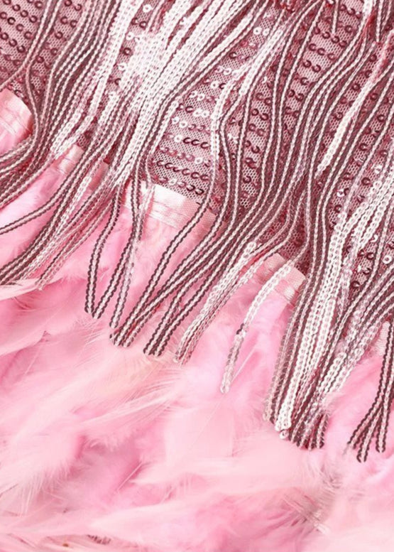 O acabamento com plumas na barra oferece um toque de extravagância que eleva o visual e faz você se destacar com elegância – sem exageros, mas com atitude.